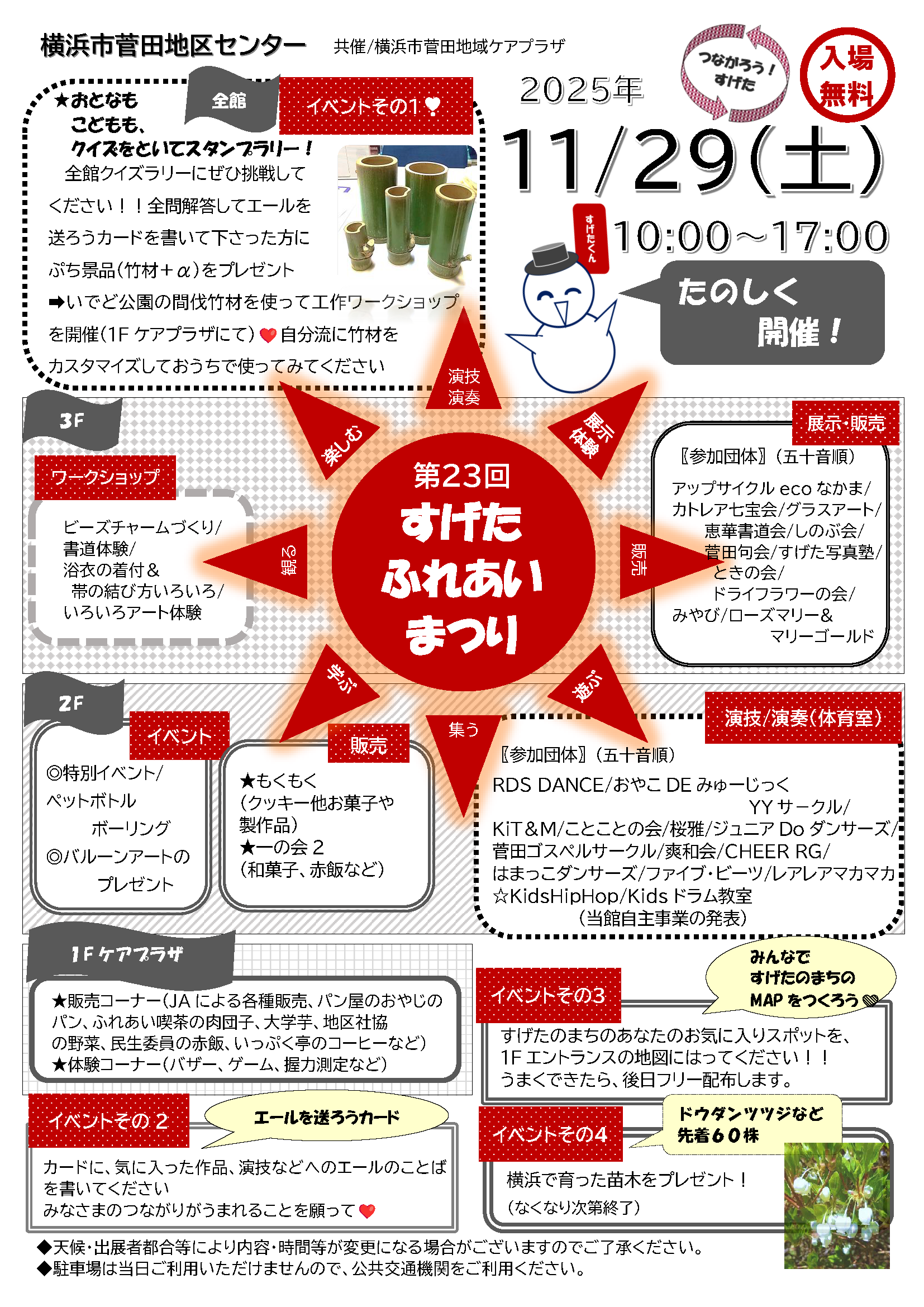 | 内容 | 今年もまつりを開催します。(菅田地域ケアプラザ共催) 来てよかった!と思っていただけるまつりを目指しています。 みなさま、ぜひぜひお越しください。詳しくは下記ポスターをご覧ください。
