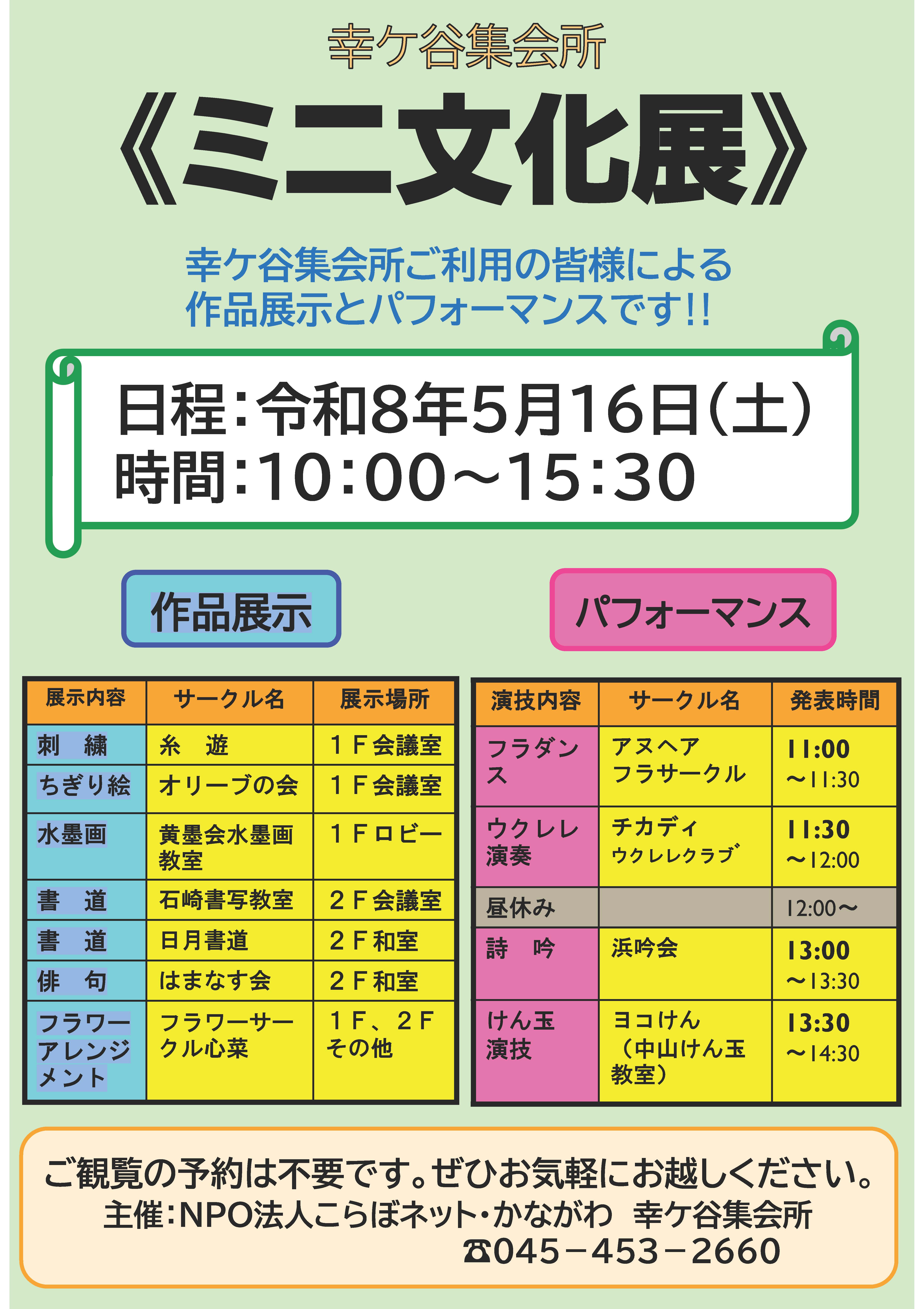 幸ケ谷集会所で活動する団体が、日頃の成果を発表します。