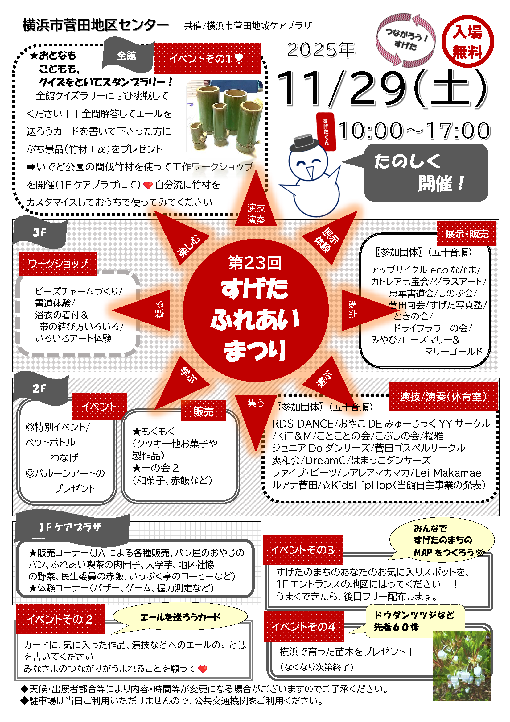 | 内容 | 今年もまつりを開催します。(菅田地域ケアプラザ共催) 来てよかった!と思っていただけるまつりを目指しています。 みなさま、ぜひぜひお越しください。詳しくは下記ポスターをご覧ください。